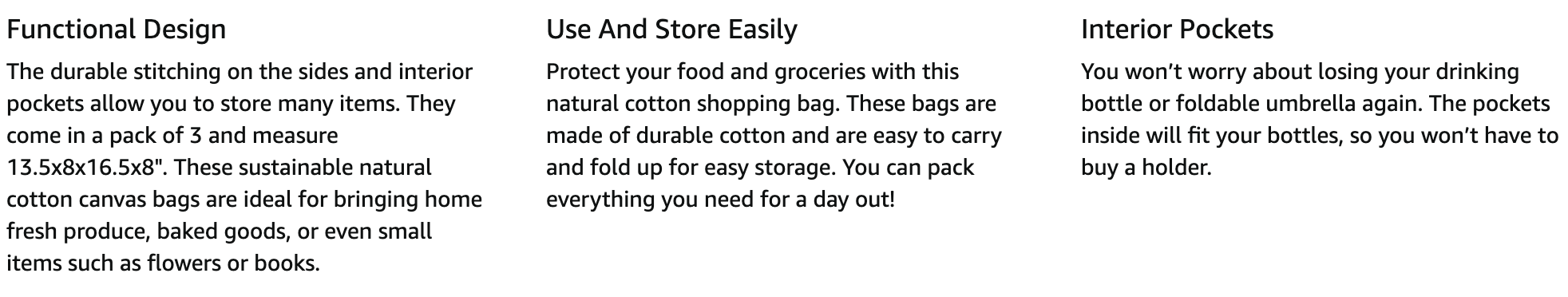 The durable stitching on the sides and interior pockets of this tote bag allows you to store many items. Coming in a pack of 3 and measuring 13.5x8x16.5x8 in size, these sustainable canvas bags are ideal for bringing home fresh fruits and vegetables, baked goods, or even small items such as flowers or books. And with a large enough interior space and long handles, your hands stay free to carry tumblers or wine bottles since they can fit into the interior pockets of this bag safely.